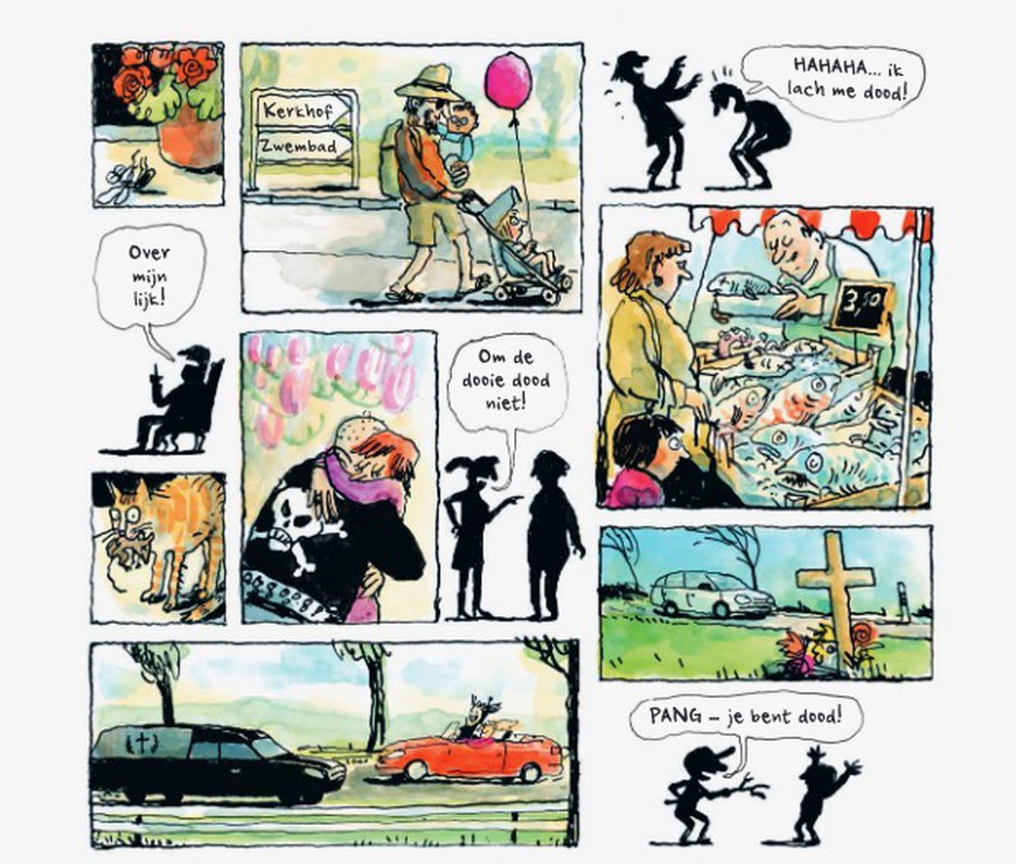 Ook ongemakkelijke zaken gaan auteur en illustrator niet uit de weg: dode dieren, wiegendood, ontbinding, dodelijke ongelukken. De nauwe samenwerking tussen auteur en illustrator is overduidelijk. Soms neemt de laatste de rol van de eerste over, zoals bij een dubbele pagina over verschillende doodskisten; behalve de traditionele versie zie je bijvoorbeeld ook een mand, een composterende kist en een zinken kist voor transport in het openbaar vervoer.