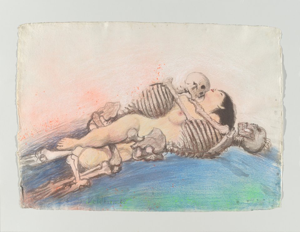 Aat Veldhoen was een Amsterdamse kunstenaar die bekend stond om zijn flamboyante karakter en kleurrijke werken. Maar hij had ook een fascinatie voor de dood, en tekende en schilderde veel skeletten. Vaak ook in combinatie met naakte vrouwenlichamen.